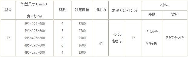 F5級(jí)袋式中效過(guò)濾器:(過(guò)濾效率40-45 %)白色或淺黃、主要用于商業(yè)大樓、劇院、車站、航空站;