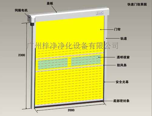快速卷簾門是以多關節活動的門片串聯在一起,在風淋室固定的滑道內,以門上方卷軸為中心轉動上下的門。卷簾門同風淋室箱體的作用一樣起到水平分隔,它由簾板、座板、導軌 、支座、卷軸、箱體、控制箱、卷門機、限位器、門楣、手動速放開關裝置、按鈕開關和保險裝置等13個部分組成。